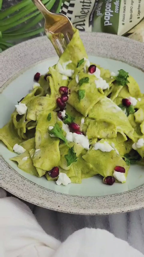 One of the many reasons we love pappardelle is because its shape holds more robust sauces and ragus! Our Garlic Herb Pappardelle has a mild and delicious flavor that enhances your meals, and also a fun shape for a variety of dishes.