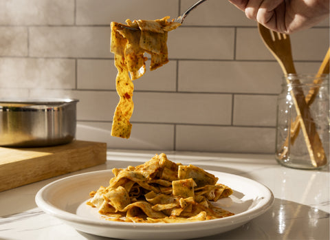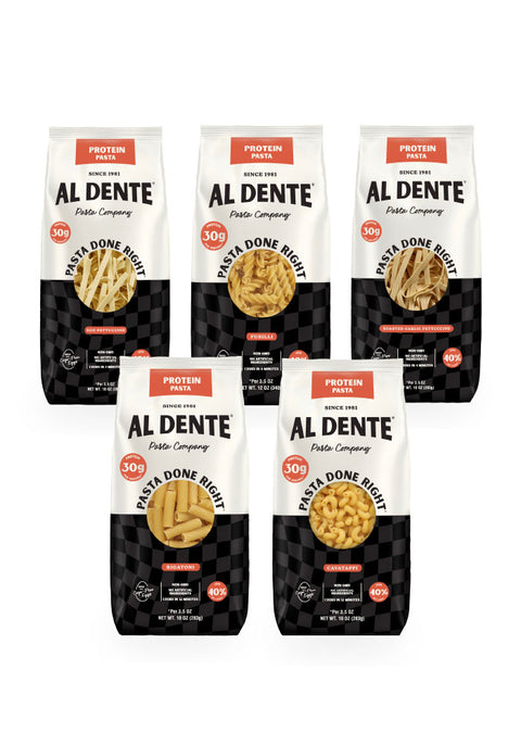 Al Dente Protein Pasta is real pasta, made better. Formerly known as Carba-Nada, this line is crafted with 100 % European wheat and fresh eggs from small family farms, delivering not just texture and bite but complete protein with all nine essential amino acids.