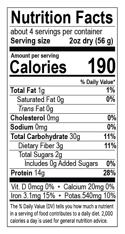 Organic red lentil flour, organic sweet potato flour. May contain traces of soy.